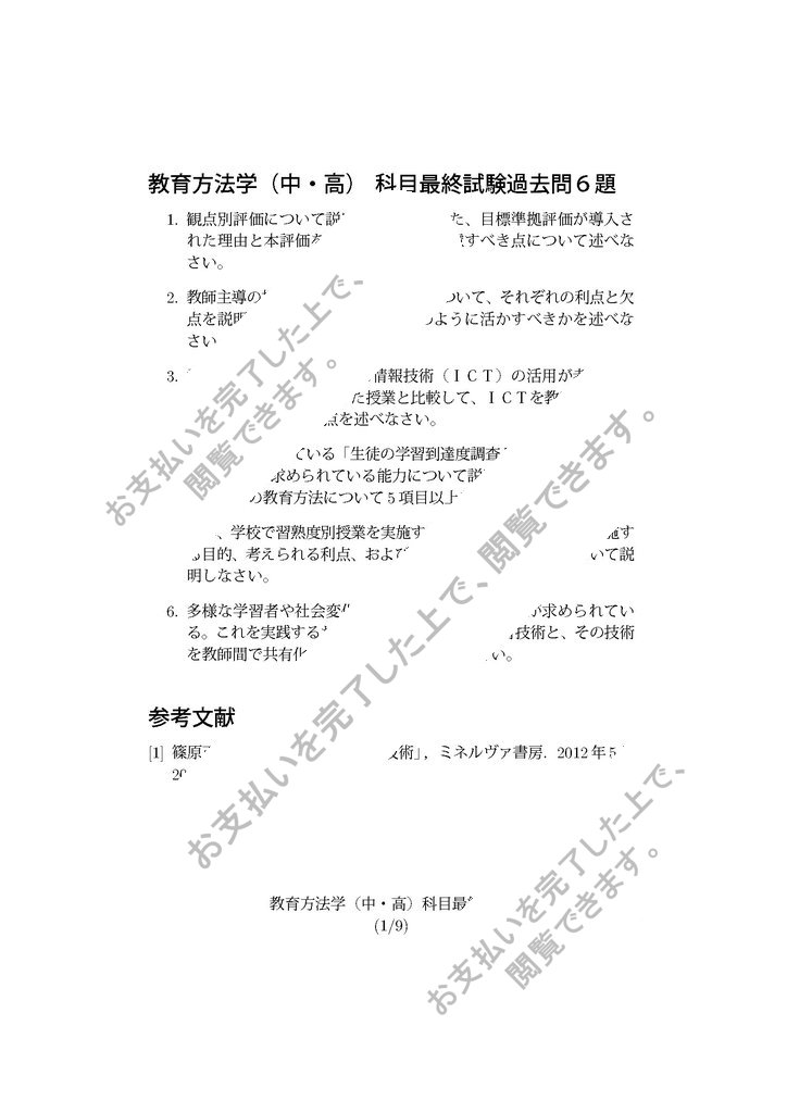 2012年度「教育方法学(中・高)」科目最終試験対策として過去問6題の答案を作成しました。実際の試験結果は6x点でした。